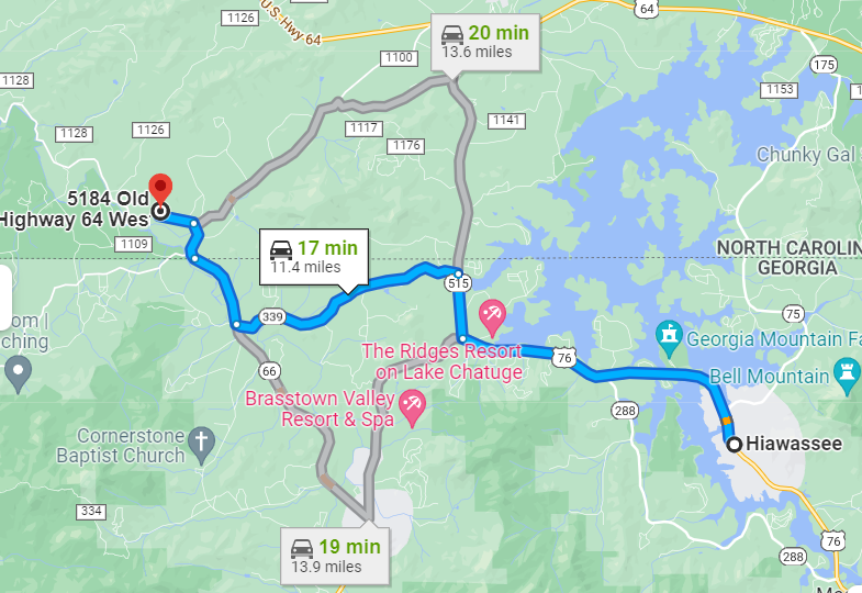 The drive typically takes 15–20 minutes via US-76 and Crooked Creek Road. A scenic and simple commute for weekly lessons.
